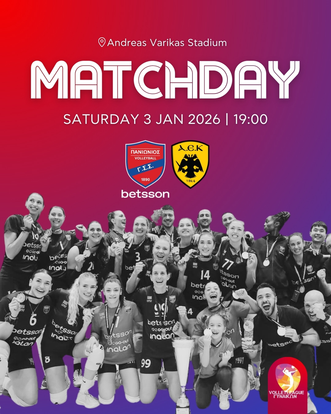 Το Σάββατο (3/1, 19:00) υποδεχόμαστε στο «Ανδρέας Βαρίκας» την ΑΕΚ για την δωδέκατη αγωνιστική της Volley League γυναικών.
