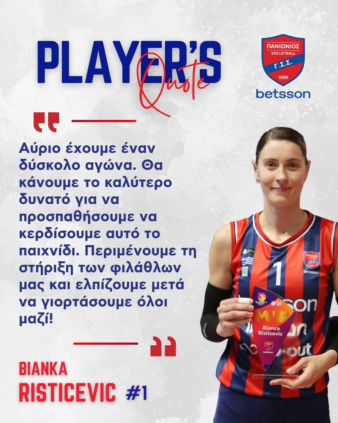 Ενόψει του αγώνα η ακραία του Πανιωνίου Betsson, Μπιάνκα Ριστίσεβιτς, δήλωσε: «Αύριο έχουμε έναν δύσκολο αγώνα. Θα κάνουμε το καλύτερο δυνατό για να προσπαθήσουμε να κερδίσουμε αυτό το παιχνίδι. Περιμένουμε τη στήριξη των φιλάθλων μας και ελπίζουμε μετά να γιορτάσουμε όλοι μαζί!»